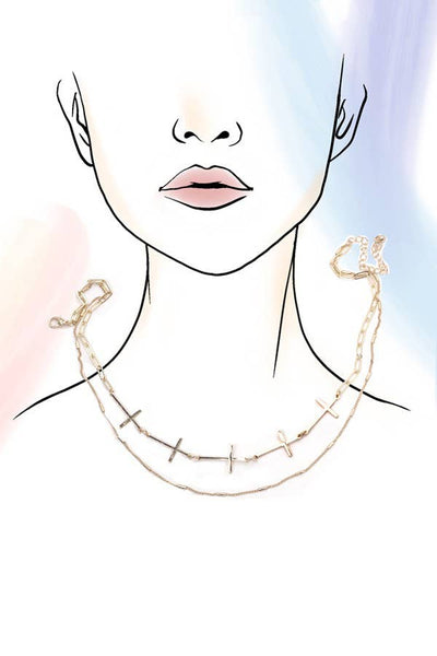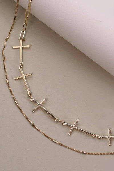 Add some flare to your day out with this multi layered cross necklace that includes a link chain, curb chain, and figure 8 chain.