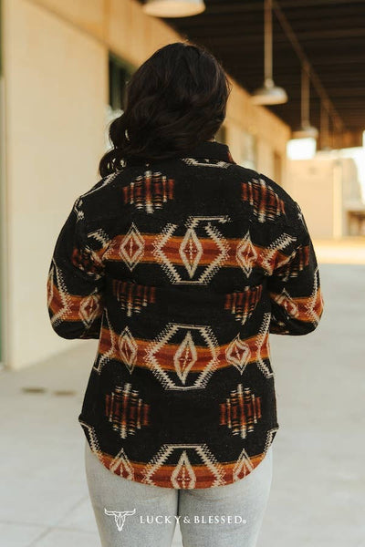 Channel rugged Western flair with this bold Aztec brushed shacket in rich tones of black, rust, and cream. Made from a soft, fleece-like fabric, this long-sleeve button-down shirt jacket offers the perfect blend of structure and warmth for fall and winter styling. The traditional Western diamond pattern adds eye-catching detail, while dual flap chest pockets and sturdy snap buttons make it both fashionable and functional. With a relaxed, unisex fit, this Lucky & Blessed staple is perfect for layering over denim, graphic tees, or turtlenecks for that effortlessly rustic cowgirl aesthetic. A best-seller for boutiques looking to stock seasonal outerwear with Western edge.