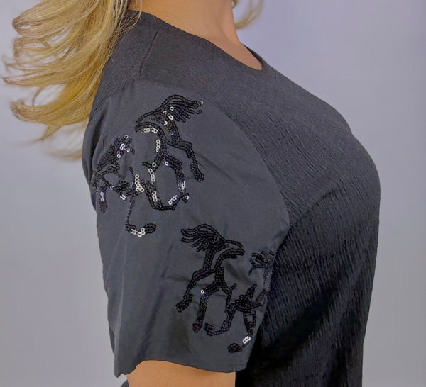 Black shirt with black sequence horses on sleeves. Mesh sleeves.