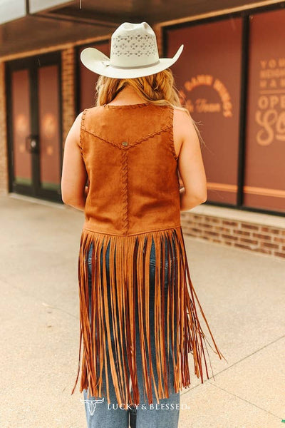 Add timeless western flair to your boutique offerings with our Camel Faux Suede Fringe Vest from Lucky & Blessed. Crafted from buttery-soft faux suede in a rich camel tone, this sleeveless open-front vest is designed with long, free-flowing fringe that adds dramatic movement and rustic charm. The front panels and neckline are finished with detailed whipstitch trim, offering a handcrafted look that pairs perfectly with dresses, denim, or layered fall outfits. This versatile piece is a must-have for rodeo season, outdoor markets, or Western-themed collections. Lightweight yet bold, it's the perfect blend of style and comfort for fashion-forward cowgirls.