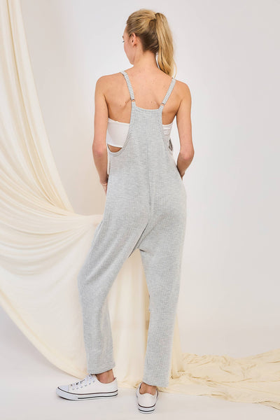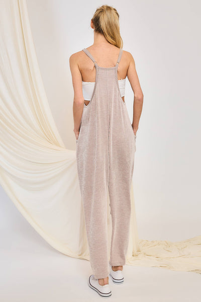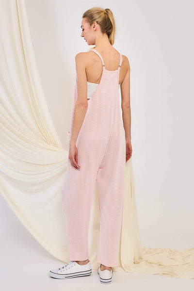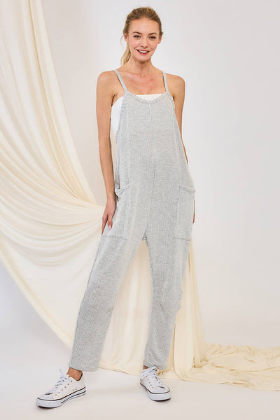 WRINKLE RIB KNIT ADJUSTABLE STRAP JUMPSUIT WITH POCKETS